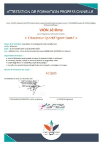 Certifié en décembre 2025, par l’organisme CAP’Formation Sport, enregsitré sous le N° 76320069032 auprès du préfet d’occitanie.